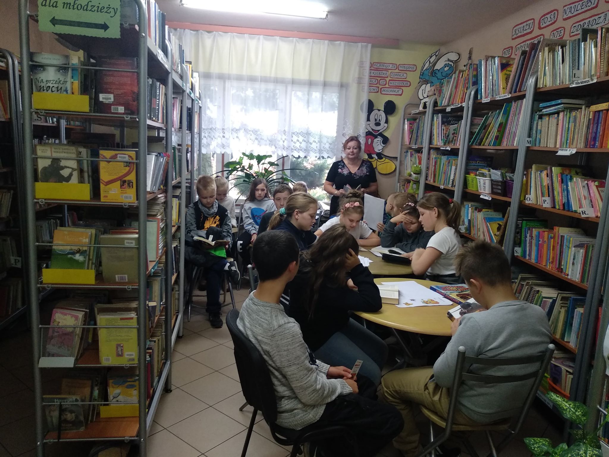 Nikogo nie trzeba przekonywać o zaletach czytania książek. 8  października br. Uczniowie klasy Vb wraz z wychowawczynią p. Agatą Karlińską udali się do Gminnej Biblioteki Publicznej im. Błażeja Stolarskiego. Było to już ich drugie spotkanie z księgozbiorem gminnym. Na początku wybrali sobie książki zgodnie ze swoimi zainteresowaniami i chętni uczniowie czytali wybrane przez siebie fragmenty. Tym samym kształcili umiejętność głośnego czytania. Następnie uczyli się wypełniać karty czytelnicze, zobowiązania i karty książek. Na zakończenie spotkania uczyli się między sobą w grupach, jak wypożyczać książki. Zapoznali się również z najnowszymi wydaniami młodzieżowymi. Dla niektórych było to nowe doświadczenie, które pozwoliło im pogłębić wiedzę o pracy bibliotekarza. Spotkanie upłynęło w miłej i sympatycznej atmosferze.