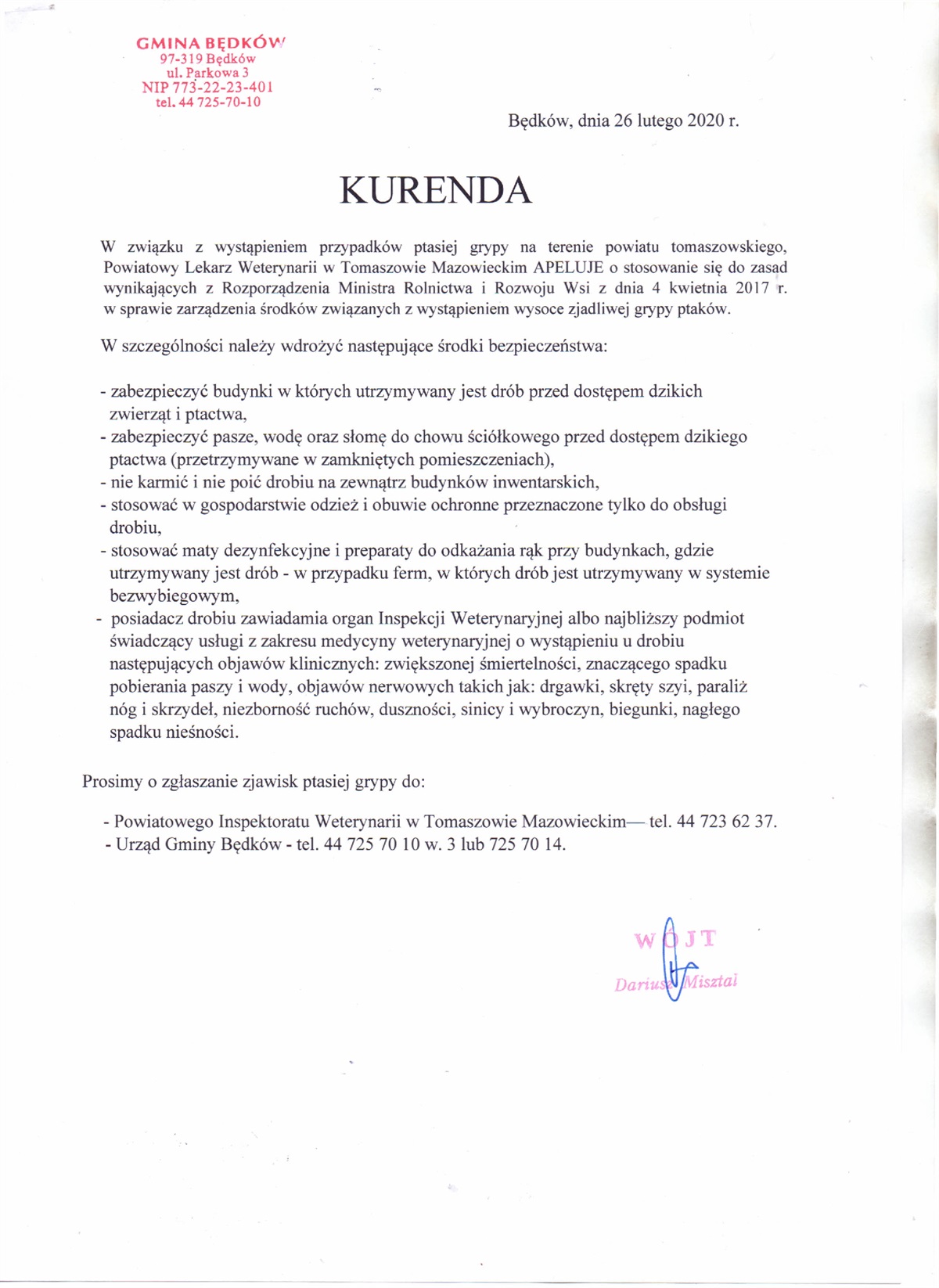 Komunikat w sprawie wystąpienia ptasiej grypy