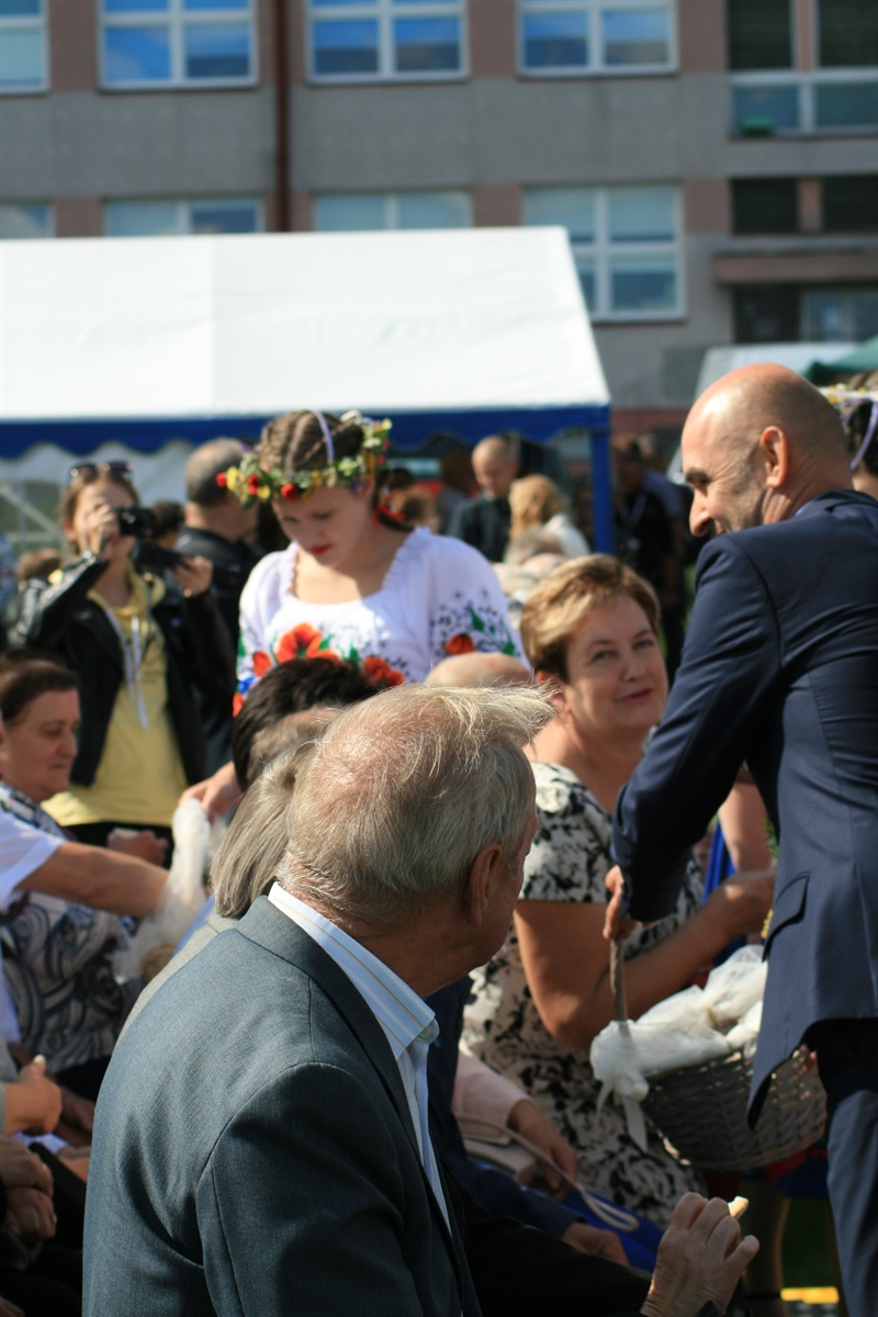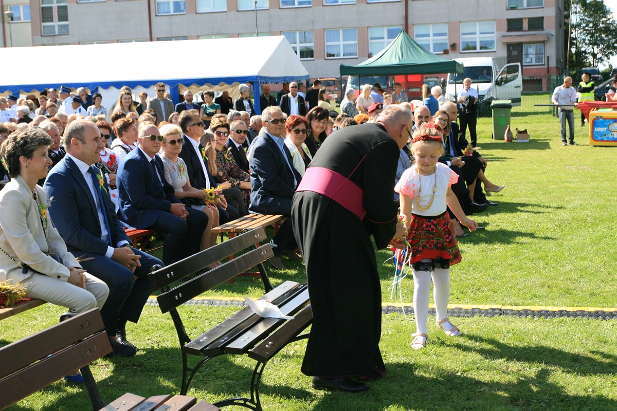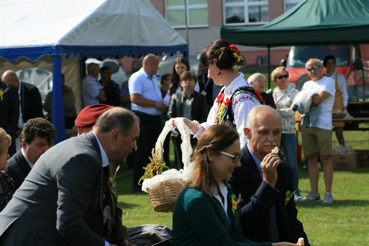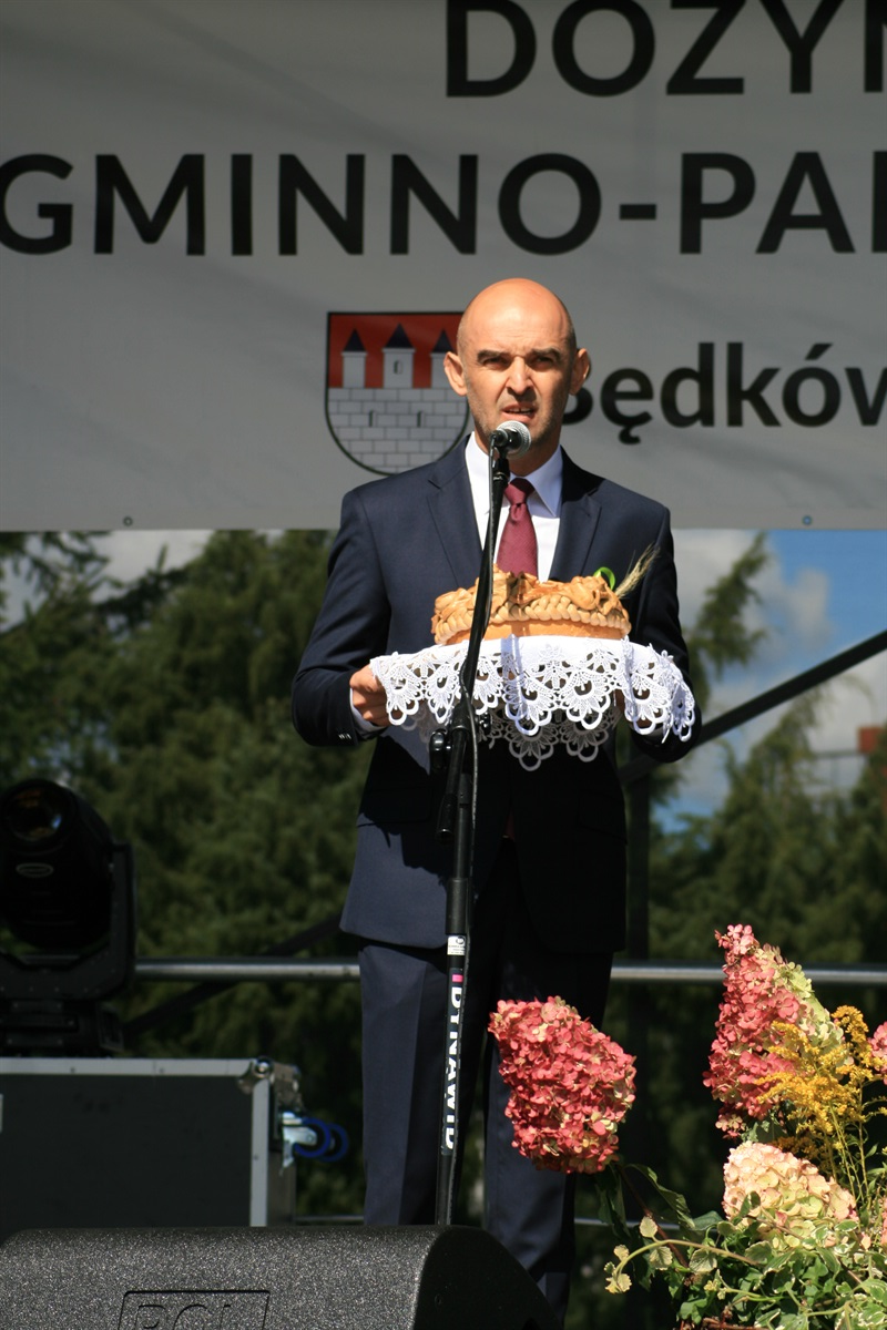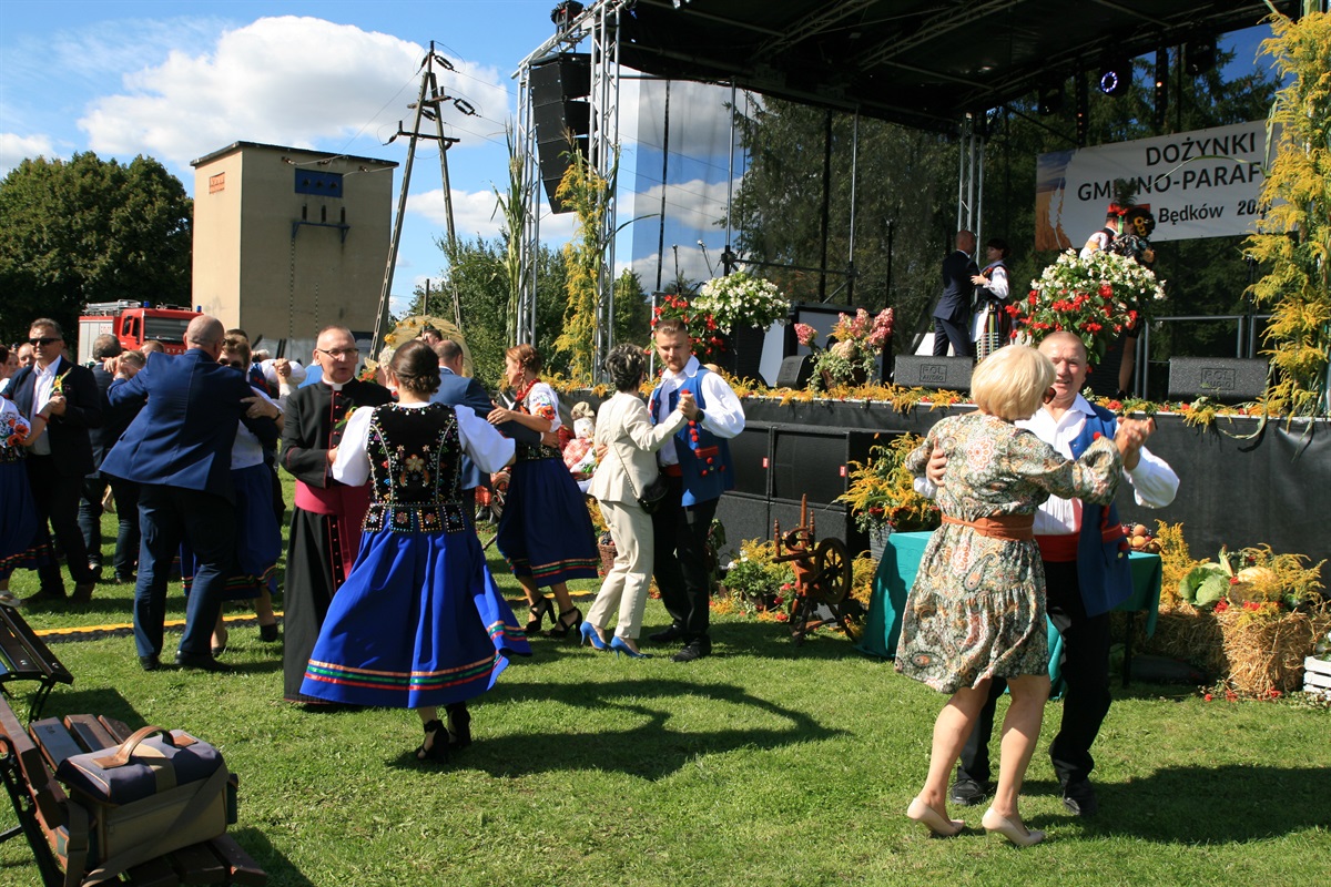 Po Mszy Świętej korowód dożynkowy udał się na boisko przy ZSP w Będkowie  gdzie odbył się ceremoniał dożynkowy - wręczenie chleba Wójtowi Gminy, przekazanie i ośpiewanie wieńca dożynkowego. Część obrzędową zakończył skoczny oberek zatańczony przez Starostów Dożynek, gości i oczywiście Wójta naszej gminy Dariusza Misztala.