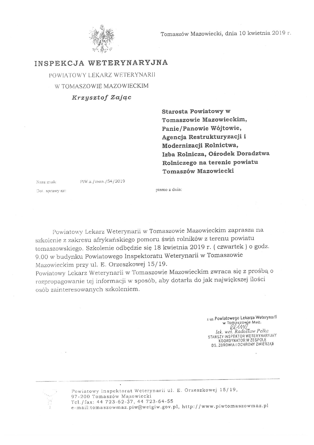 Szanowni Państwo,W nawiązaniu do pisma Głównego Lekarza Weterynarii z dnia 3 czerwca 2025 r. o numerzeWChZZ.432.279.2025, mając na względzie okres letni, podczas którego ryzyko transmisji wirusaASF ze środowiska naturalnego do gospodarstw utrzymujących świnie znacząco wzrasta, istotnymaspektem prewencyjnym jest zintensyfikowanie działań informacyjnych, mających na celu szerzeniewiedzy na temat sposobów zapobiegania rozprzestrzeniania się choroby.Zgodnie z danymi Agencji Restrukturyzacji i Modernizacji Rolnictwa na 28 maja br., wwojewództwie łódzkim jest utrzymywane ponad 1030000 sztuk trzody chlewnej w 5019 stadach(gospodarstwach), dlatego podnoszenie świadomości wśród hodowców i producentów świń,przedstawicieli branży związanej z produkcją wieprzowiny, myśliwych, pracowników LasówPaństwowych i osób przeprowadzających kontrole z ramienia instytucji państwowych oraz osóbmających kontakt ze zwierzętami z gatunków wrażliwych (świnie, świniodziki i dziki) jest kluczowew ograniczeniu rozprzestrzeniania się wirusa afrykańskiego pomoru świń.W związku z powyższym, Łódzki Wojewódzki Lekarz Weterynarii zwraca się z prośbą o:dystrybucję ulotek i materiałów informacyjnych wśród podległych jednostek oraz osóbzainteresowanych (w załączeniu przekazuję opracowany przez GIW wzór ulotki oraz ulotkize strony EFSA) zamieszczanie komunikatów prasowych oraz informacji w mediach społecznościowych i nastronach internetowych podnoszenie świadomości o zagrożeniu wystąpienia afrykańskiego pomoru świń wśródpracowników.Więcej informacji na temat afrykańskiego pomoru świń dostępne jest na stronie:Głównego Inspektoratu Weterynarii https://www.wetgiw.gov.pl/nadzor-weterynaryjny/afrykanski-pomor-swin oraz Wojewódzkiego Inspektoratu Weterynarii w Łodzi https://bip.wiw-lodz.pl/dzialalnosc/afrykanski-pomor-swin-asf.Ulotka 1Ulotka 2Ulotka 3Ulotka 4